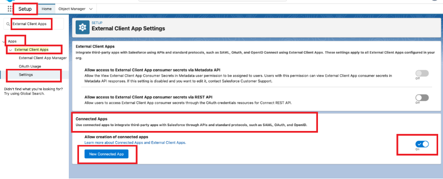 Connected Apps are disabled by default on all new orgs, so enable them first in Salesforce.