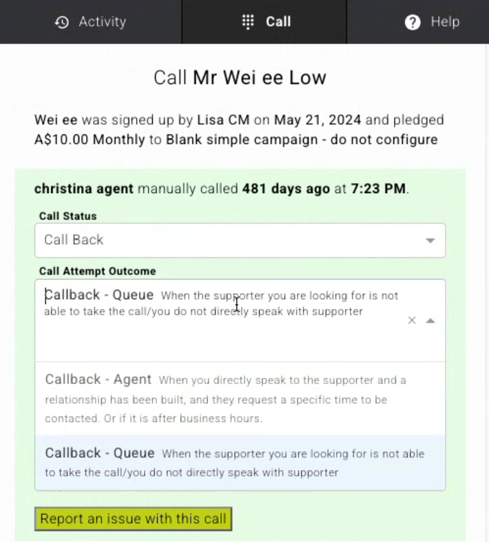 - Scheduling: An agent sets a Callback date, time, timezone, and reason while on a call or viewing a donor record.