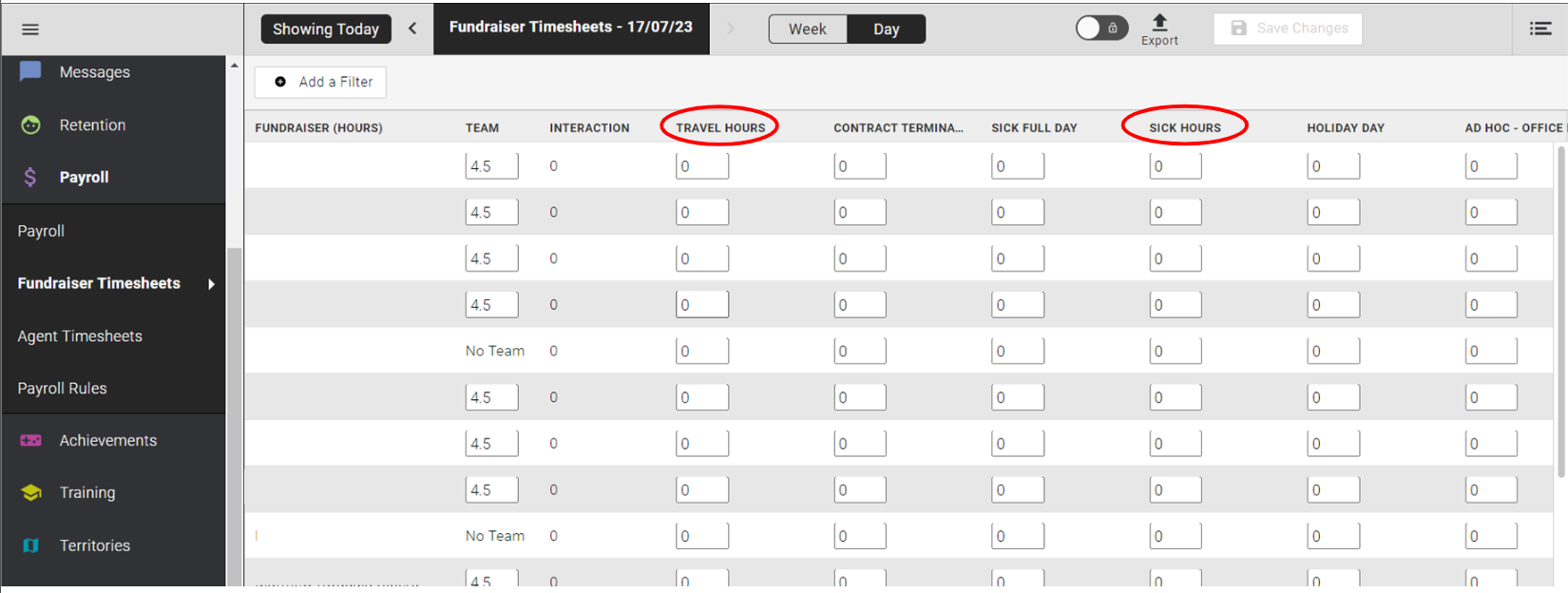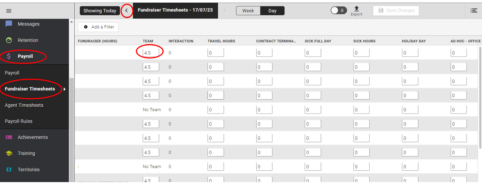 - In the Payroll / Fundraisers Timesheets section, ensure all data for the period is correct.
