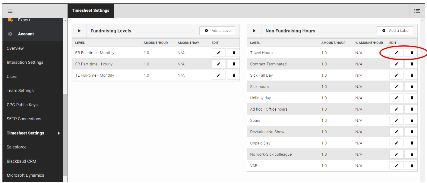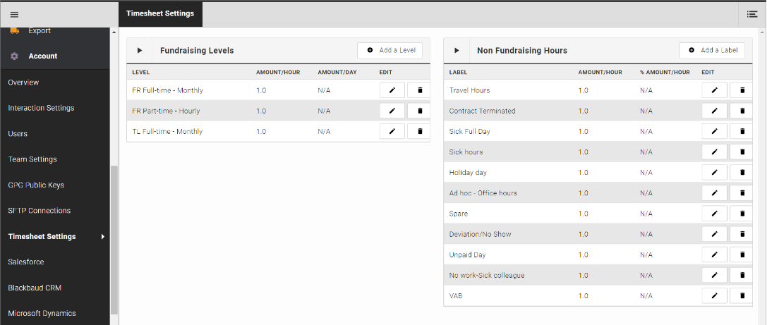 In the Timesheet section you can also record all other types of hours for each active fundraiser. These “other” hours can be anything you want.