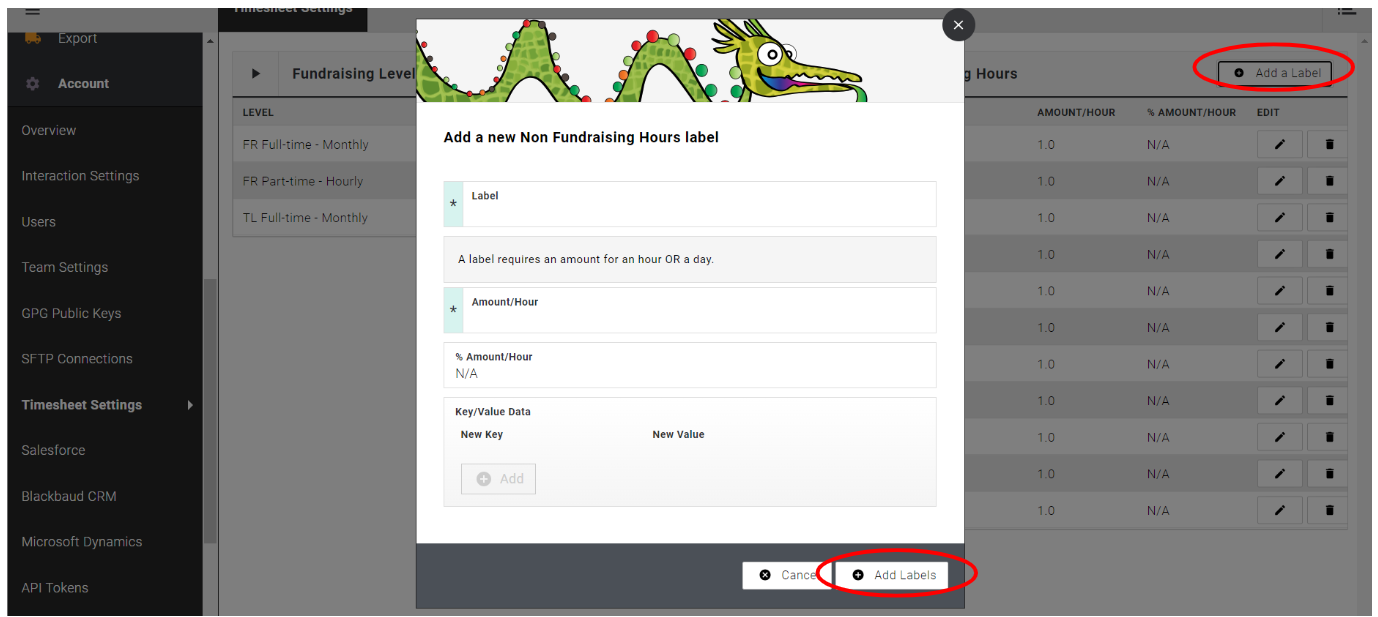 These new labels will appear as columns in the main Timesheet section for you to fill in.