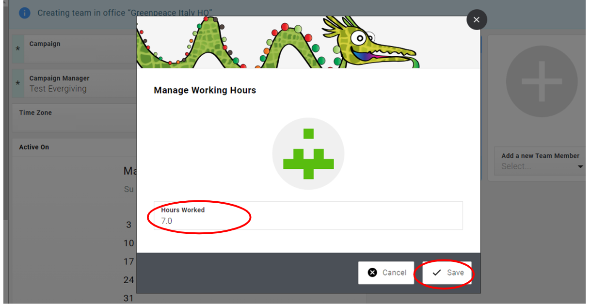 Working, or fundraising, hours are set as a default value at an account level. This default value is currently set at 7 hours per day, so fundraisers assigned to a team will have 7 hours registered against their names for every day they are on a team.